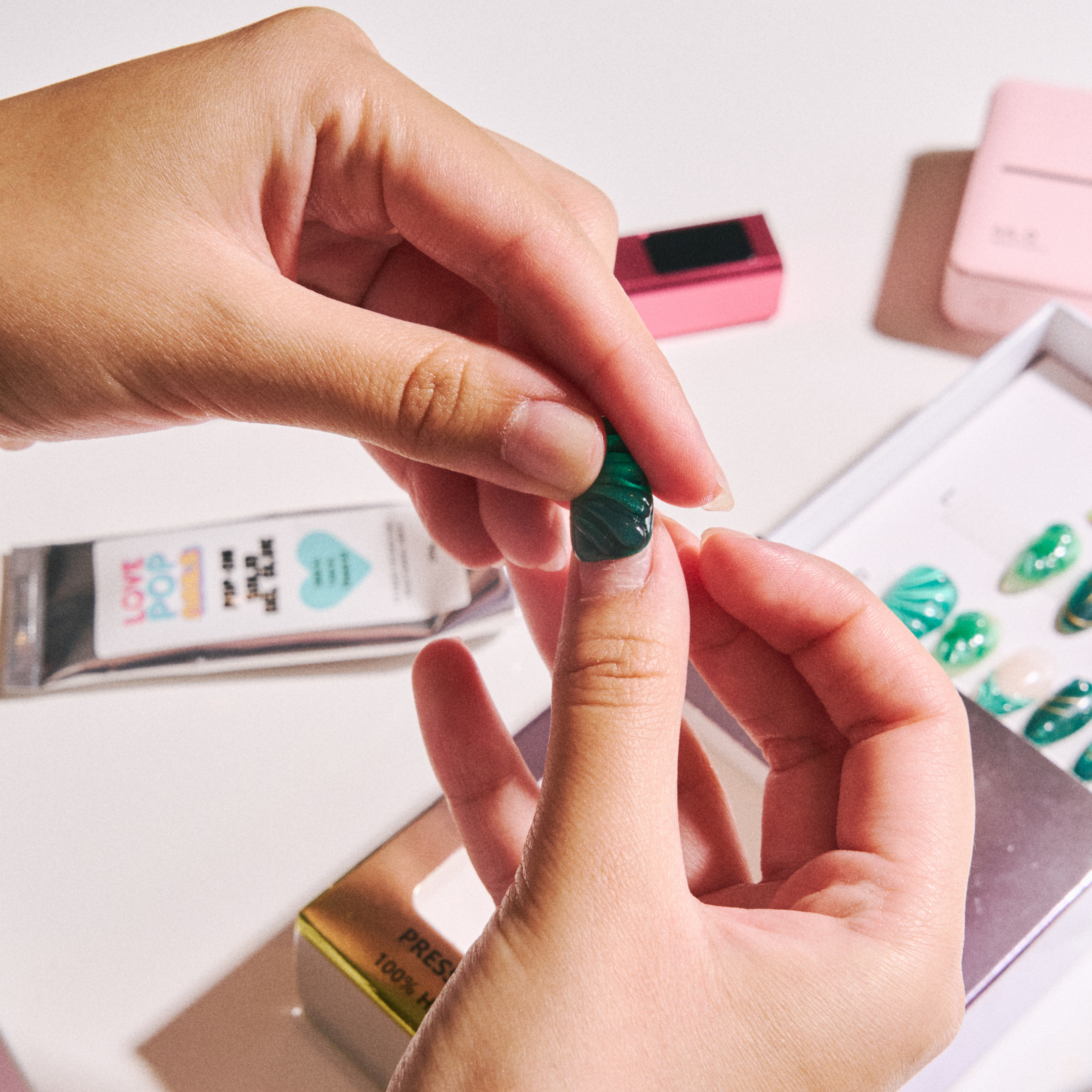 1. Gently lift the edges of the press-on nails using a cuticle stick to create a small gap between your natural nails and the press-on nails.